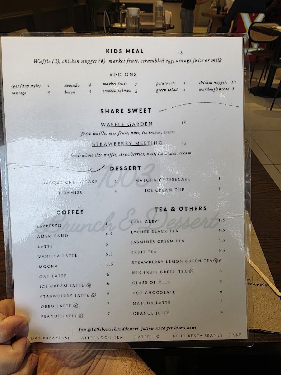 One of the highlights at 1003 Brunch & Dessert is their Breakfast Platters, featuring dishes like the Meat Sausages with two different flavors, green salad, potato tots, waffle or bread, market fruit, and two eggs. Another must-try is the Smoked Duck Breast Platter, with thinly sliced smoked black pepper duck breast served with eggs, roasted potatoes, vegetable salad, toast, and balsamic sauce.