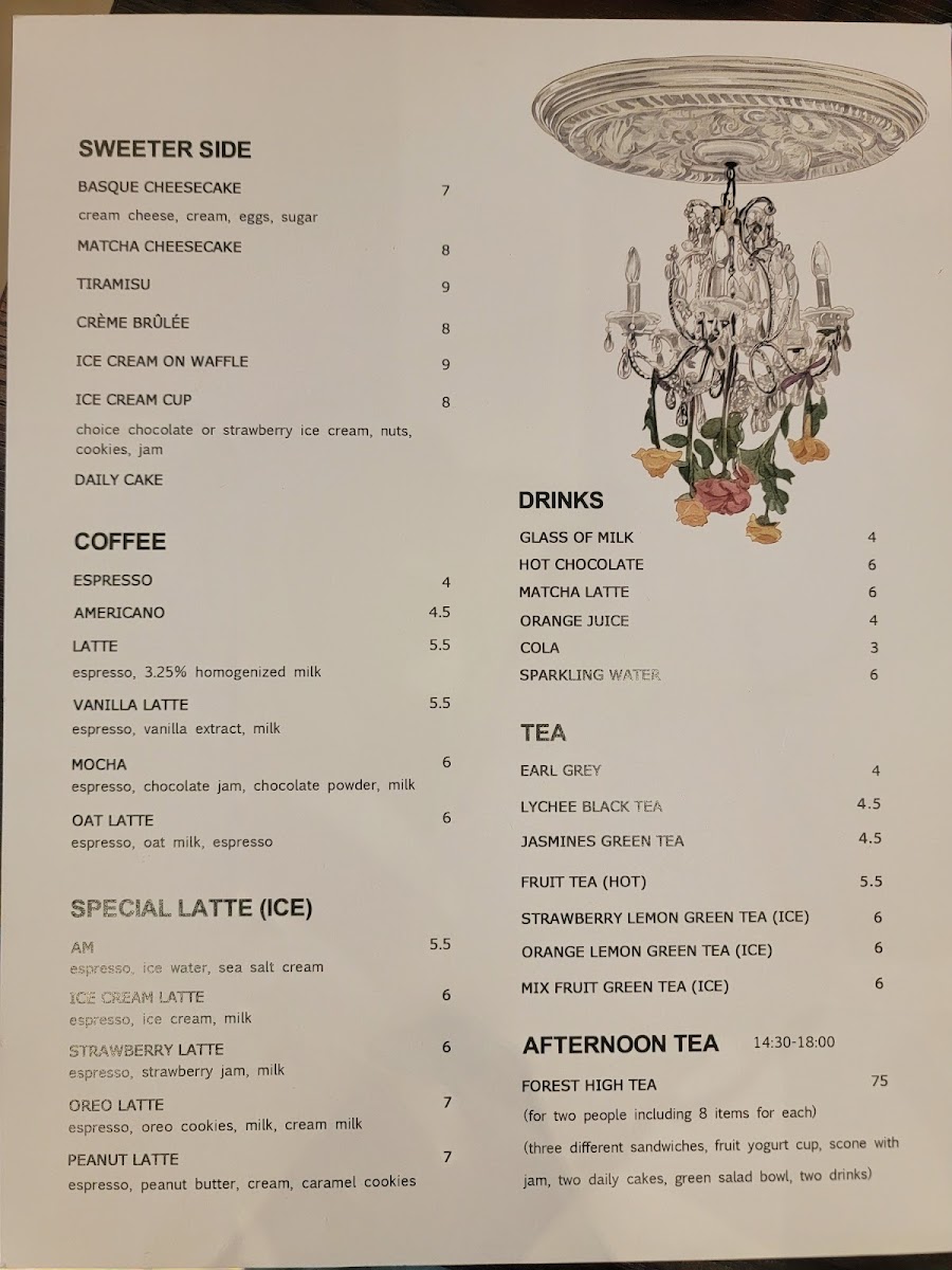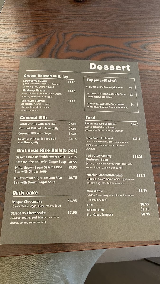 For those with a sweet tooth, indulge in the Waffle Garden topped with ice cream, fresh fruit, white chocolate, and cream, or the Basque Cheesecake made with cream cheese, eggs, sugar, and flour. Pair your meal with their specialty coffees like Latte Coffee, Ice Cream Coffee, or Strawberry Latte, or opt for a refreshing Green Tea like Mix Fruit or Strawberry Lemonade.